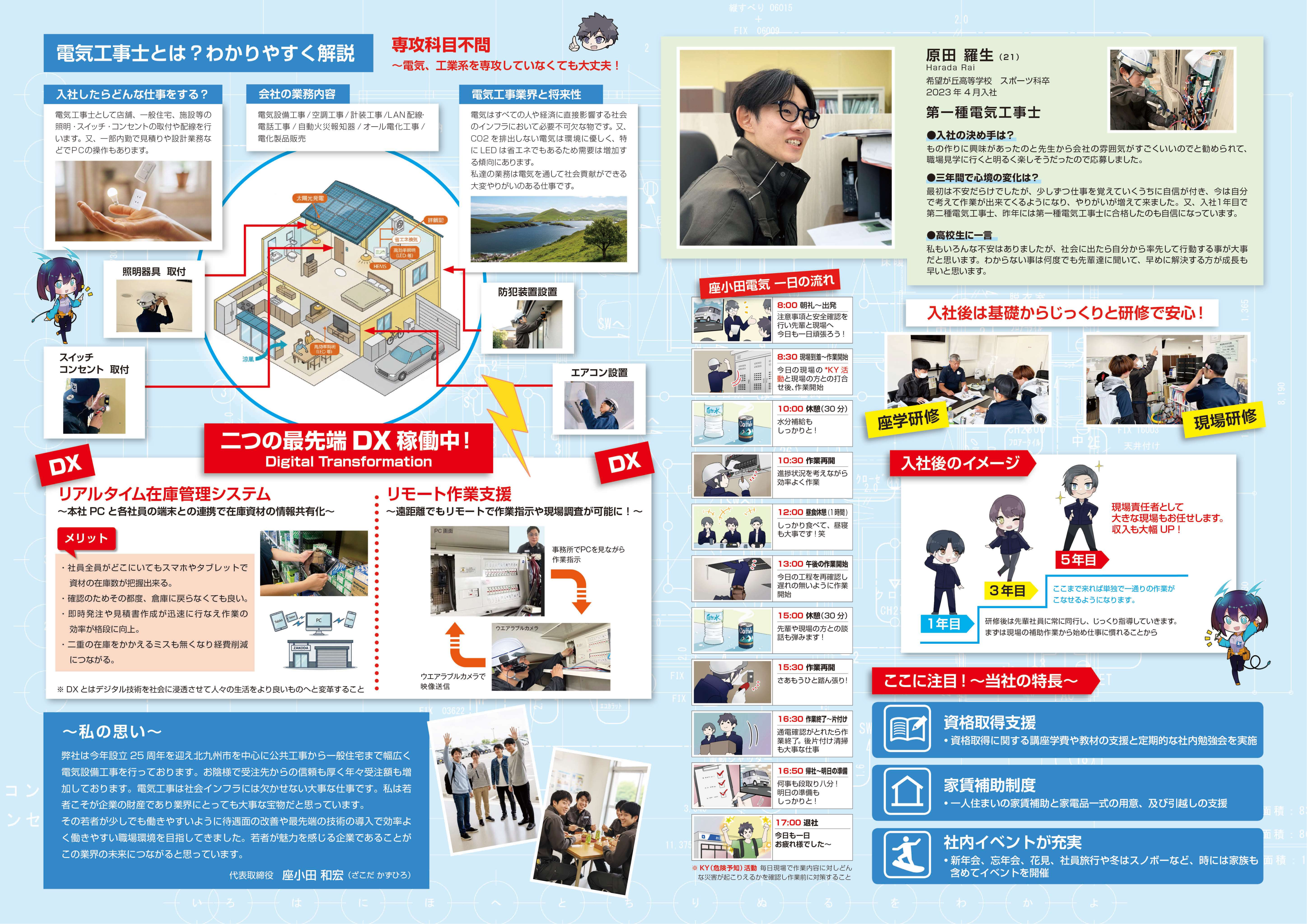 A.座小田電気の魅力は、「人」と「取り組み」に分けられると思います。「人」に関しては、理系大学院で学んだ方や経営コンサルティングに従事した方など、面白い経歴の人がいます。そのような方々と身近に働くことで、刺激を得ることができます。また社長を始め、ほかの社員の方もいい人ばかりです。また「取り組み」については、上記のように多様な経歴の人材がいるため、オンライン遠隔工事といったIT技術を活用した取り組みも実現しています。新しい取り組みや事業に挑戦できる環境は魅力的です